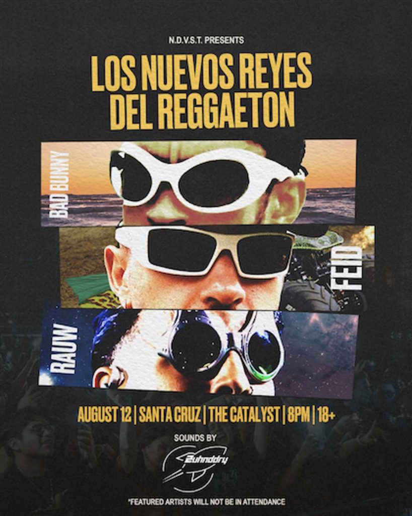 Tickets $15 Early Bird/ $20 Advance/ $22 General Admission/ $25 Last Chance // 18+ N.D.V.S.T PRESENTS: LOS NUEVOS REYES DEL REGGAETON DJ NIGHT La mejor musica de Bad Bunny, Rauw Alejandro y Feid toda la noche The Catalyst – Santa Cruz Sat. August 12 8PM-12AM 18+ We’ve been delivering hit Bad Bunny parties for a while now… Time to give some air space to the other kings of the genre. PR and Colombian vibes all night to keep us on our feet — perreando — as we should With sounds by @zuhnddry BB X FEID X RAUW NO ESTARÁN Follow us @NOCHEDEVERANOSINTI
