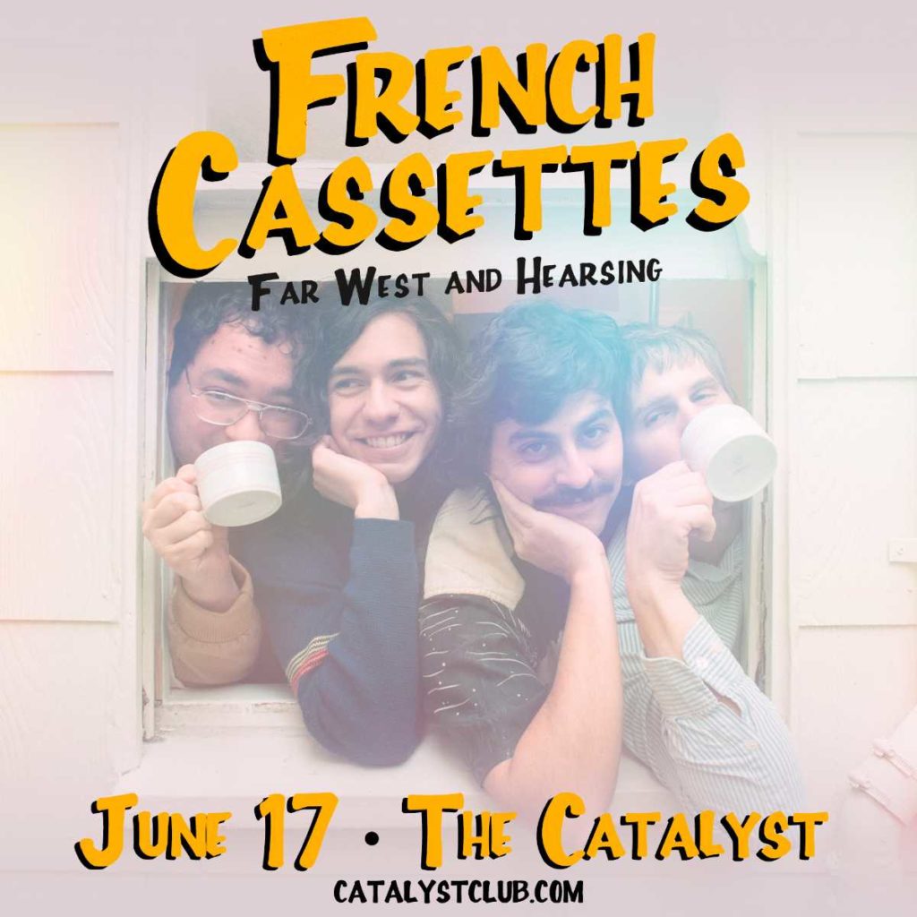 Tickets $15 in advance/ $20 once doors openwith FAR WEST and HEARSING French Cassettes music is filled with winding melodies that pop up unexpectedly but grab hold and don’t let go… and may leave you asking “who needs hands with hooks like these?” The harmony-driven power-pop quartet’s new LP, Rolodex (Sophomore LP released on Tender Loving Empire), was conceived beneath a stairwell in the band’s adopted hometown of San Francisco, where frontman Scott Huerta spent months staying up until 4 am, obsessing over elaborate demos that would eventually become his band’s sophomore album. “I adopted the mentality, which was probably unhealthy, that every song I wrote needed to be my favorite song,” he remembers. “I lost my mind so many times in the middle of the night.” The album was self-recorded by lead guitarist Mackenzie Bunch in just about every corner of the Bay Area, and the songs that were eventually stitched together are hook-filled and rooted in pop. But they’re also layered and intricate recordings: complex vocal harmonies and counter-harmonies, Rob Mills’ inventive percussion, Thomas’ (Scott’s brother) honey-coated basslines, and every shade of clean and fuzzy guitars stacked up like an orchestra. These uncommonly majestic, esoteric pop forms serve as the perfect delivery service for Huerta’s playful and verbose lyrics, which are often presented as semi-autobiographical puzzles. Taken together, the eight tracks and 24 minutes that make up Rolodex are an epic statement of purpose in a decidedly taut package. One that brought a band back together, more mature and more ambitious than ever.