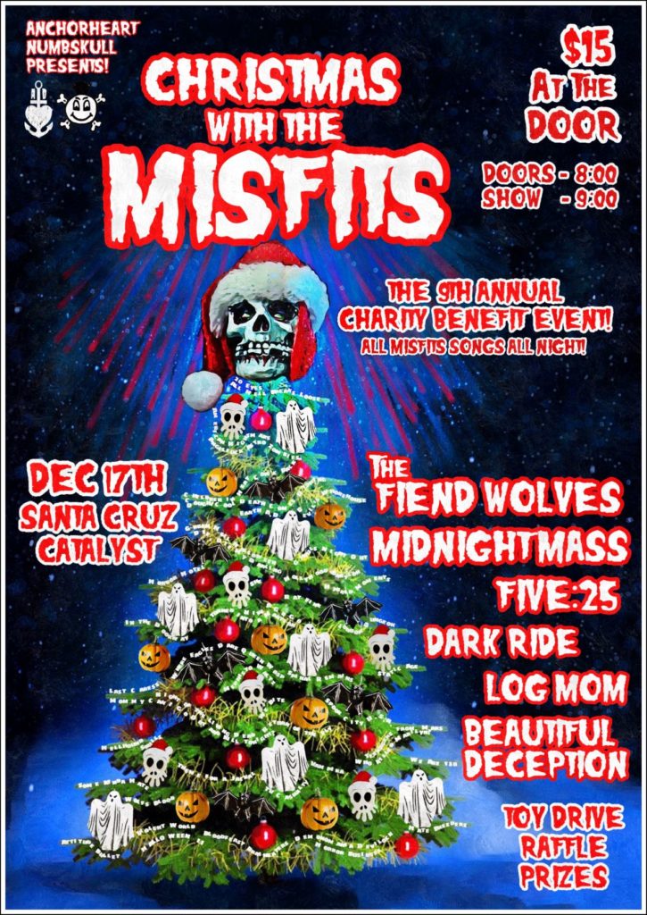 Tickets $12 in advance / $15 once doors openCHRISTMAS WITH THE MISFITS – 9TH ANNUAL CHARITY BENEFIT The Fiend Wolves, Midnight Mass, 525, Dark Ride, Log Mom, Beautiful Deception This will be the 9th Annual CHRISTMAS WITH THE MISFITS benefit show!This year, on Sat Dec 17th. Numbskull and Anchorheart Presents!Christmas with the Misfits! A Misfits themed Christmas benefit show to help raise money for charity, and bring toys to those in need. It will be held at The Catalyst in The Atrium. ALL AGES!Christmas and Misfits themed Costumes and dress up highly encouraged! We will be including a toy drive as well. Toys are donated to the children’s ward at the local Hospital.The Toy Drive is coupled with a raffle as well. Bring a toy and receive 5 raffle tickets. Additional tickets available for $1. Tickets are good for prizes to be won through out the night. If you’ve been to previous years XmasFits, we’ve had some good prizes, like;Tshirts, Music gift certs to Streetlight, Music instruments and accessories, Skate Board Decks, Tattoo Gift Certificates, and more!! We want this to be a party! And a nice little break from the madness of Christmas and Holiday shopping, and everything else that goes with it. With decorations and dressing up and Misfits songs and sing alongs all night! This will be a fun, productive, and beneficial to the community.